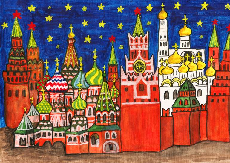 View of Moscow, Kremlin and Saint Basil's Intercession cathedral, in style of "naive art". Gouache painting on paper. Kremlin is a middle ages fortress in centre of Moscow, with many cathedrals inside. Saint Basil's Intercession cathedral stands on Red square near Kremlin fortress. It is one of t...