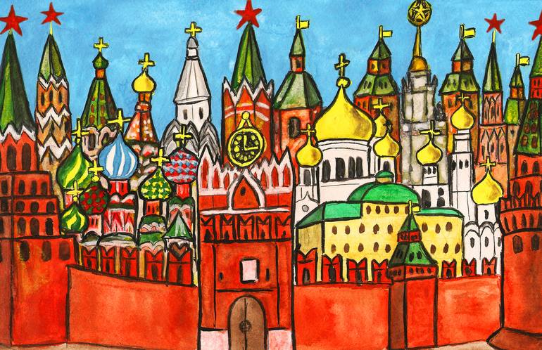 Painting: Gouache on Paper, Symbolic view of Moscow, Kremlin fortress and cathedrals, horizontal.
