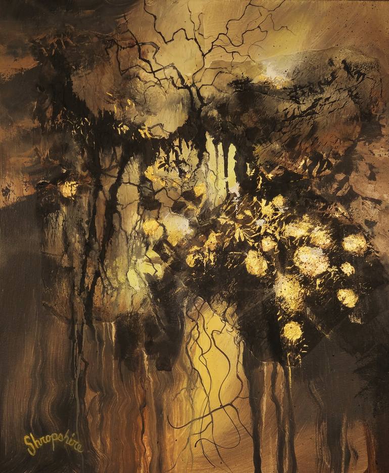 Mother Lode I actually used metallic gold acrylic paint for the organic globular shapes which then suggested gold nuggets to me. This painting is heavily textured with black painted sides and on wide gallery wrapped canvas. It is wired for hanging and does not require a frame.