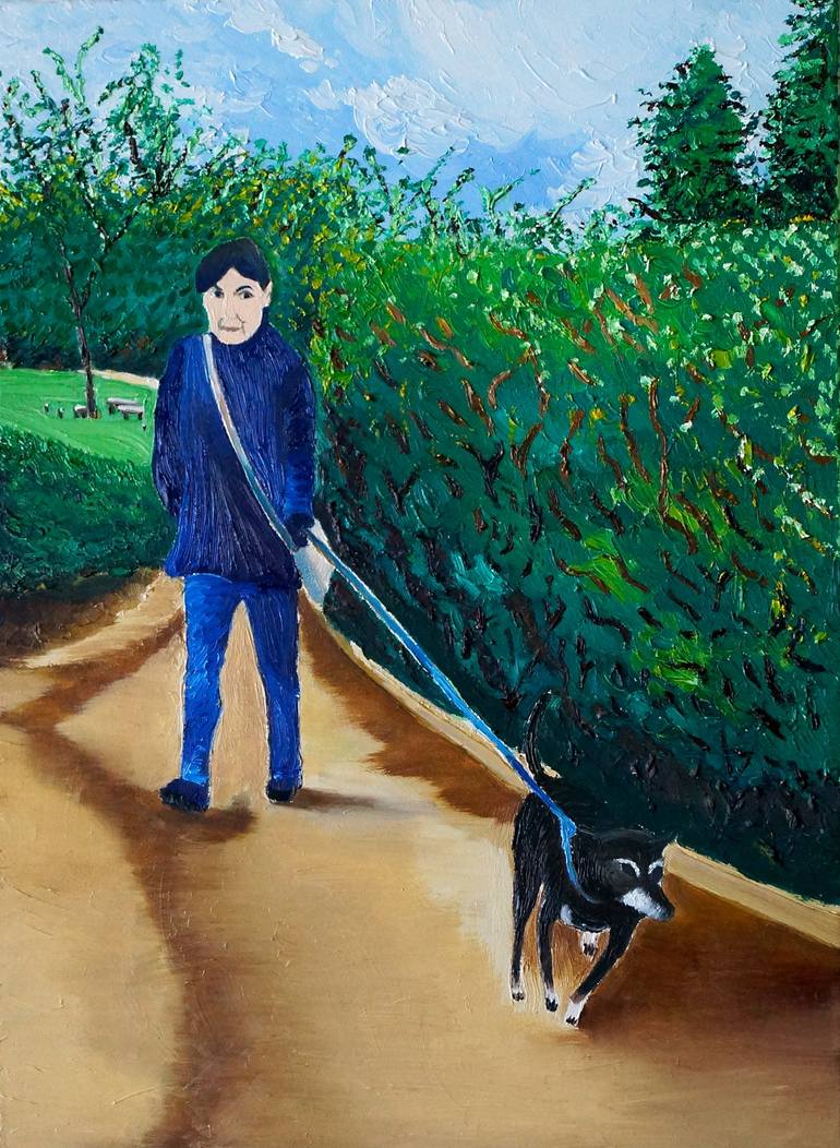 This oil painting captures a heartwarming moment of a mother and her eldest son's dog Cheech taking a stroll in the park. The expressionist style of the painting conveys the simplicity and joy of this everyday scene. The blue coat of the mother and the small black dog Cheech stand out against the na...