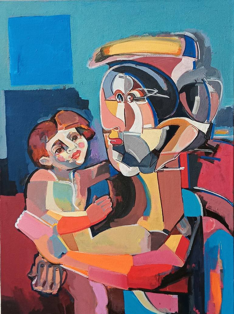 Original large figurative painting. Acrylic, gouache on canvas stretched on a wooden frame. Inspired by Picasso, Jorge Condo, Jean-Michel Basquiat, and everyday life. Cubism, abstract, expressionism, figurative. Impasto. The master-quality material has been used. Heavy impasto builds with brushes...
