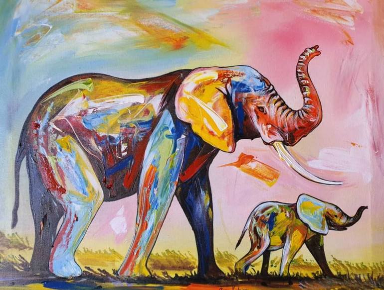 Abstract animal and landscape painting with elephants. A colorful, textured artwork inspired by the beauty of landscapes, wildlife and nature. Wall art piece created using acrylic painting on fine art canvas by artist Ema Kato. Signed in front, unframed. Available to acquire via Saatchi art gallery.
