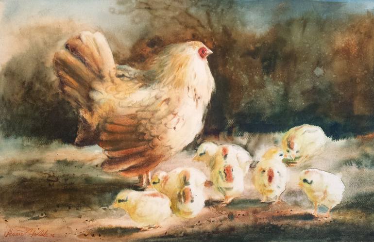 Amidst a serene natural environment, a mother hen gracefully leads her eight tiny chicks, guiding them through the open landscape. Each step reflects her unwavering care and protection, embodying the essence of motherhood in the animal world. The vibrant greenery and warm sunlight enhance the simpli...