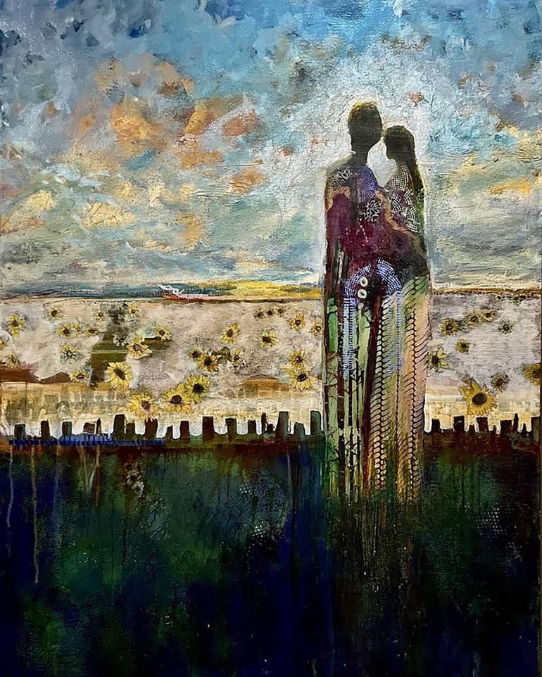 This painting started as an abstract painting and I read a story about a family in Kyiv that struck me so deeply that I changed directions. It was a story of love and patriotism. He was going to fight and she and her daughter were trying to cross the border into Poland for safety. Their love for e...
