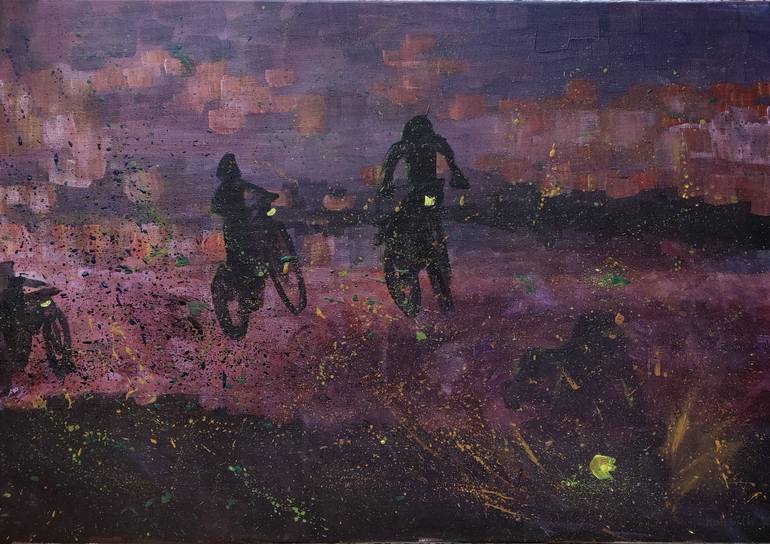The painting depicts silhouettes of motorcyclists racing against a twilight sky. The dark palette, with shades of purple and pink, creates an atmosphere of mystery and wild freedom. The motorcyclists seem to emerge from the night’s darkness, and the splattered paint conveys a sense of speed and adre...