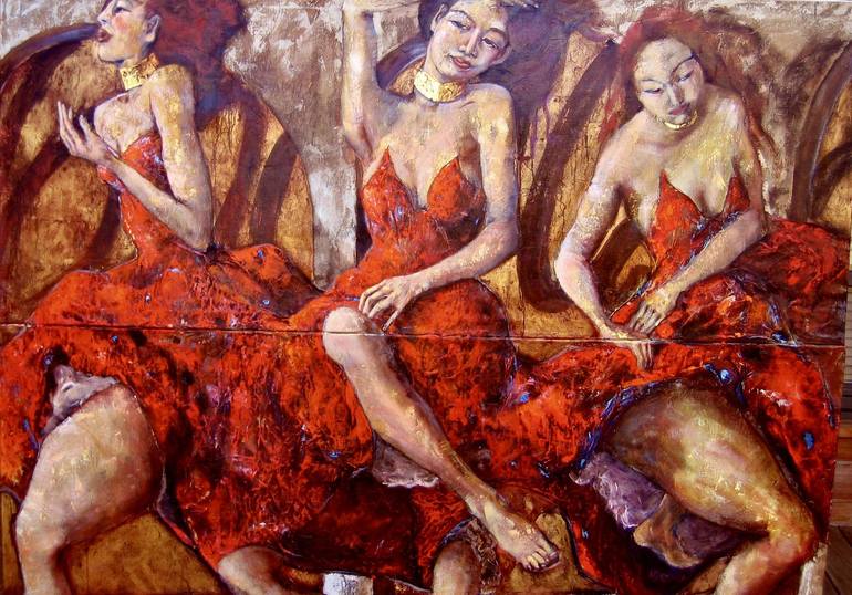 Paris and its 'Moulin Rouge' inspired this work I express the sensuality and beauty of those women. The rich and warm colors such as red and gold express the warmth and sensual expressions. The dresses floating around them accentuate the actif and joyful movements. This work is in two parts of 220/...