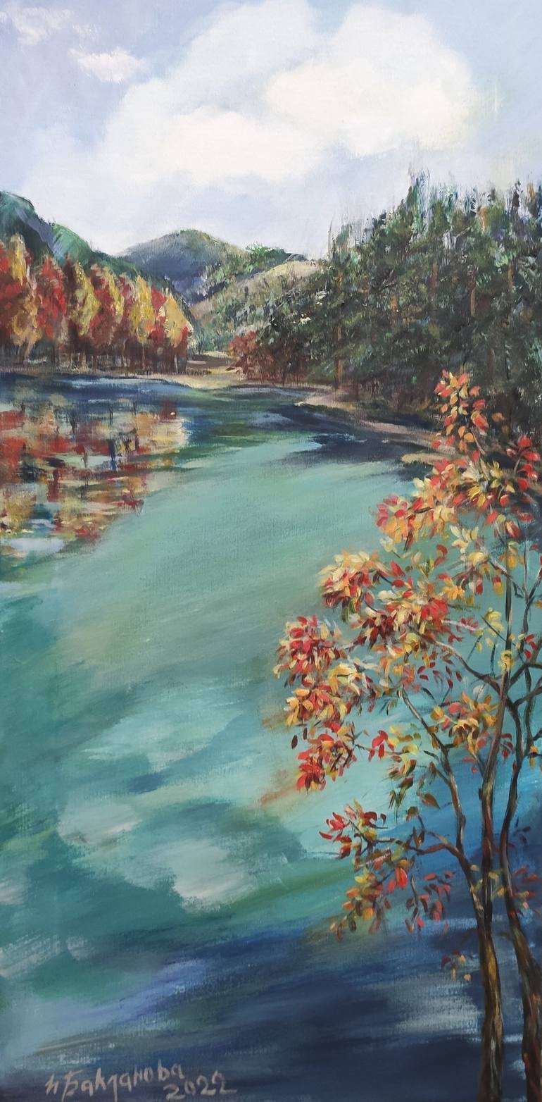 Mountain Lake Autumn landscape Vibrant Fall leaves Scenery Original Acrylic painting on stretched cotton canvas Size 16x32"(40x80 cm) 2022 Signed Coated with acrylic varnish Unframed Sides painted Ready to hang A romantic and cheerful plot will be suitable for any room to up your mood This bright a...