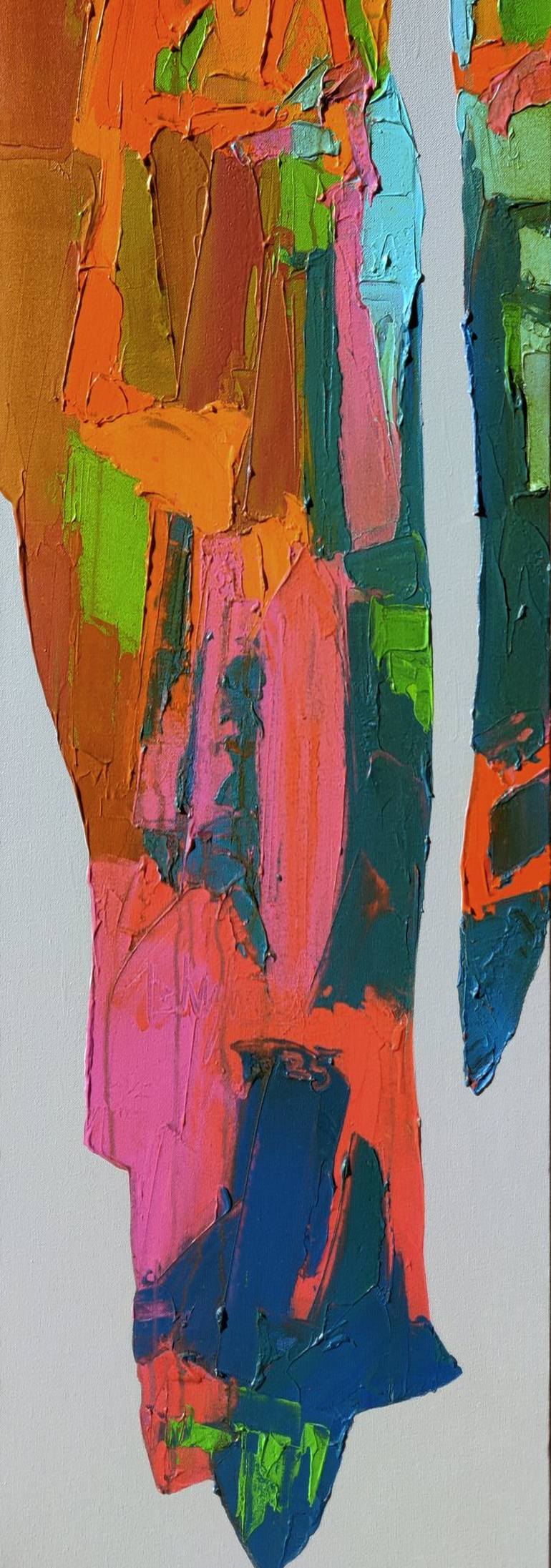 This striking abstract painting transforms a mountain landscape into a bold exploration of color and texture. The composition is dominated by vertical forms that echo the towering nature of mountain formations, while thick impasto technique creates a richly textured surface that mirrors geological s...