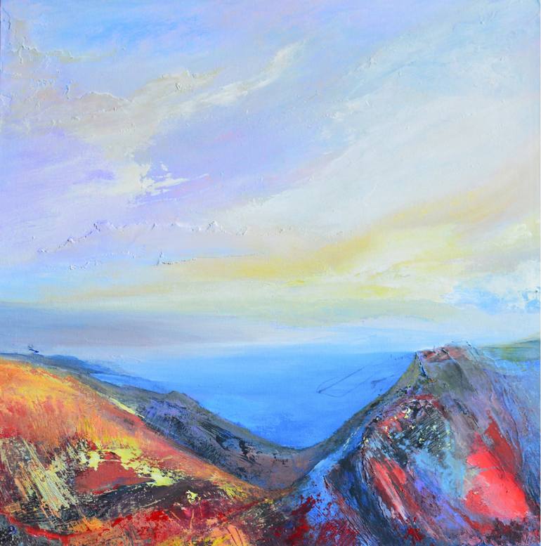 Abstract mountain landscape painting with bright saturated colors. Using acrylic paint on cardboard (2 mm). Unframed painting. Signed Certificate of Authenticity.