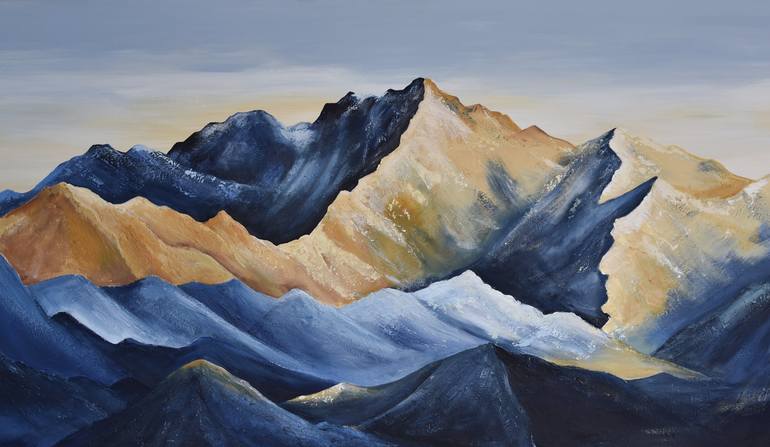 Mountain peaks and blue skies are associated with freedom, achievement and height. Frosty pure white snow and the warmth of the setting sun. The mountain landscape is well conveyed by the relief technique, which adds a nice texture to the picture. The blue and beige color of the painting goes well w...