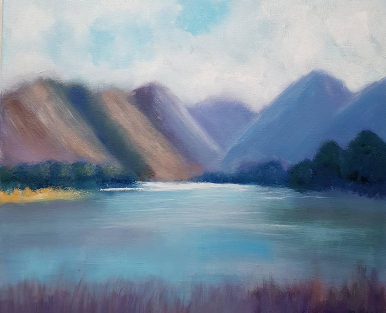 Oil on canvas This evocative painting, beautifully captures the splendor of a mountainous landscape. The lake, mirroring the clear sky, serves as a luminous focal point, creating a harmonious link between earth and sky. The vibrant vegetation and the icy peaks of the mountains add rich visual textur...