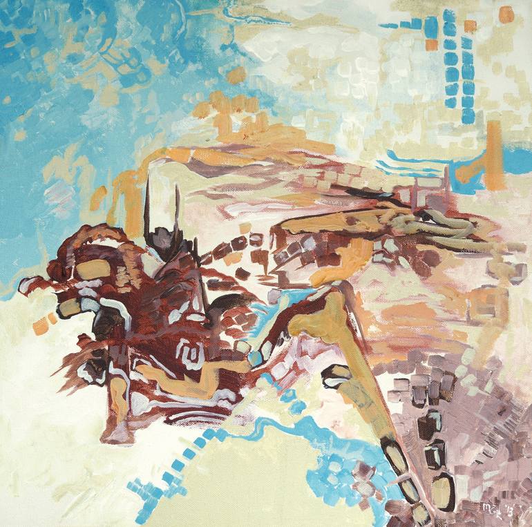 A Japanese informed abstract landscape in both style and subject matter. Depicts a mountain scene upon which a large equestrian samurai figure emerges as if galloping right off the side of the mountain. The blue of the sky is mirrored in the waterways forging themselves down the mountain. A pinkish ...