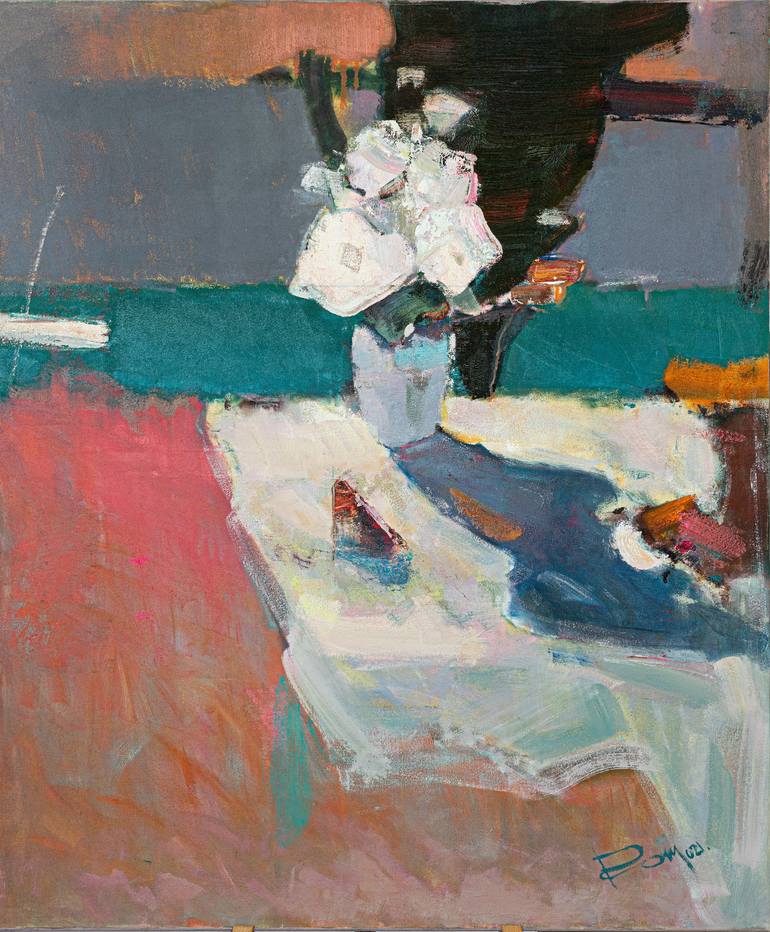 The artist used snow-white colors, thereby creating a bright floral range. Flowers stand in a room in a conspicuous place. A neat table is covered with a lace napkin, which speaks of the thriftiness of the residents. Flowers decorate the room and harmoniously fit into the interior. An artist shows h...