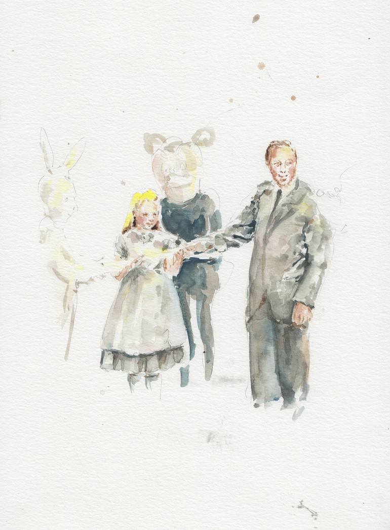 This is a watercolor painting of Mr. Walt Disney together with his creations Alice, Mickey and a big bunny.