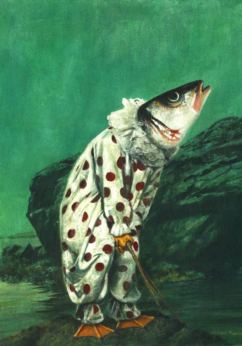 This painting shows a surreal mutant fish creature dressed as a clown. he is hauling in a net in a greenish moody seascape. The original was painted in acrylic on cotton.