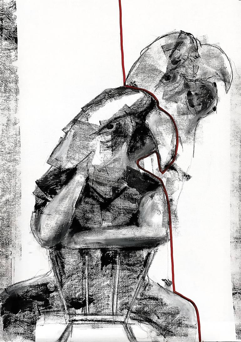 I present to your attention an exquisite black and white painting made with acrylic on canvas, depicting a man with a parrot's head sitting on a chair. This unusual composition attracts the eye with its surrealism and depth of symbolism. The figure of a man with refined features, complemented by a ...