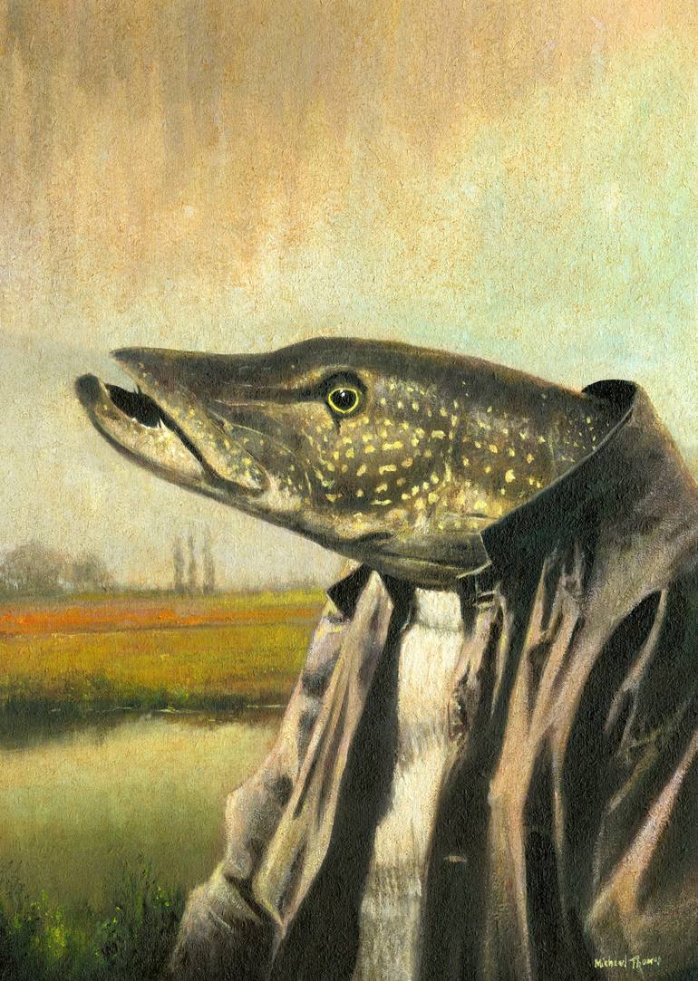 This painting shows a sinister Mr Pike lurking on a riverbank. The original was painted in acrylic on chipboard making the most of the textured surface.