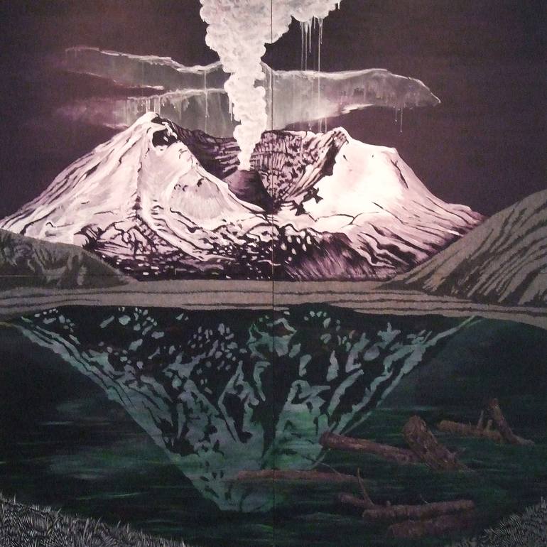 Mt. Saint Helens and it's past reflection in a pond. This is a polyptych. In other words, it is four panels hung together to make one painting.