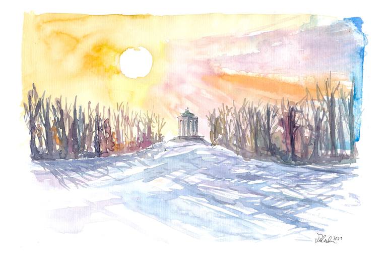 Munich Monopteros Romantic English Garden in Winter Landscape Scene - Watercolor on paper
