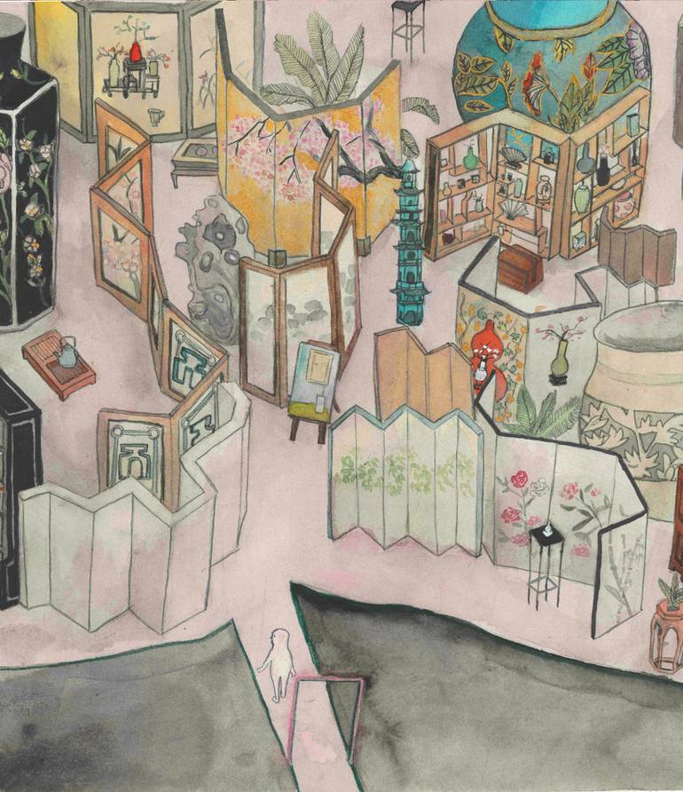This work is part of my part of a conceptual illustration series, “A Journey in Clouds,” which visualizes a dreamlike inner journey. The small figure in the composition wanders through a labyrinth that resembles both a museum and a mind — filled with ancient shelves, porcelain objects, and corridors...