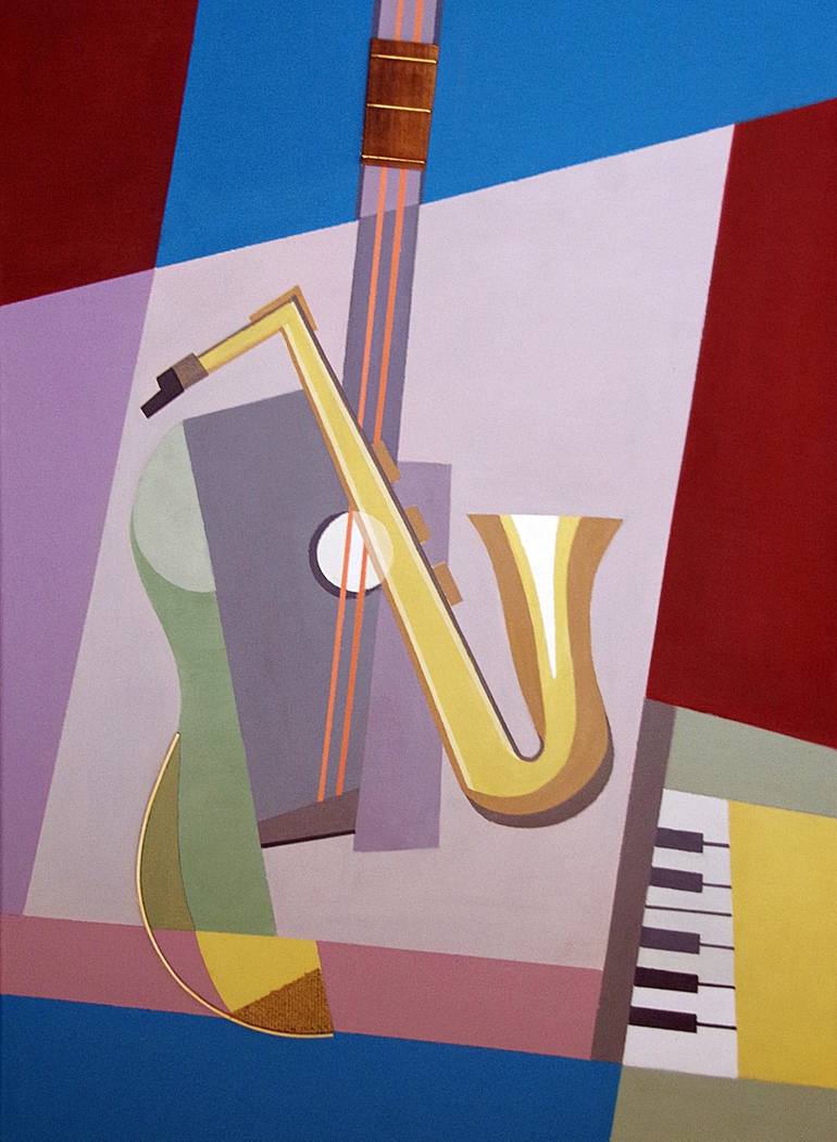 I am inspired by music, the picture brings the atmosphere of peace and joy. Guitar elements are used. The picture is painted in a geometric style.