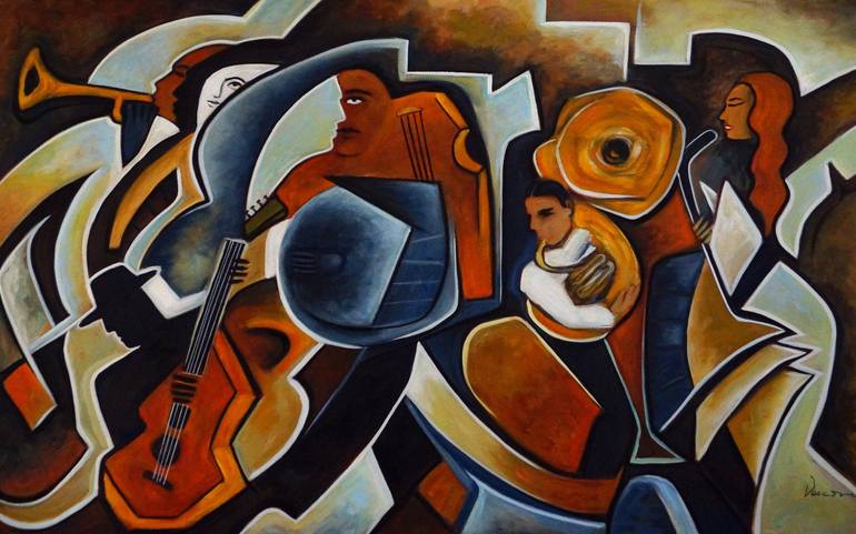 I started painting in bars, restaurants and the street, I painted life, people, music, street scenes. I painted on a lot of different surfaces, wood glass, metal, with oils, acrylics, pastels. My scenes started abstracting, which is life with the reality slightly peeled away to reveal the underlying energy, emotion,and movement. When I paint dancers I want the viewer to feel the movement, when I paint musicians I want them to feel the music. My abstractions of musicians and dancers have evolved into a style which could be referred to as “Rhythmic Cubism”. My palette ranges from raw earth tone harmonies to luscious crimson and scarlet to cerulean blues and deep ultramarine. High contrast and the dynamic use of line add to the power of my work. “My surrealistic world is converted into visual poetry inspired by passion, feelings and personal experiences. I paint a divers and complete story. Phrases are expressed in paint with very elaborate colors that reach the eyes of your soul.”