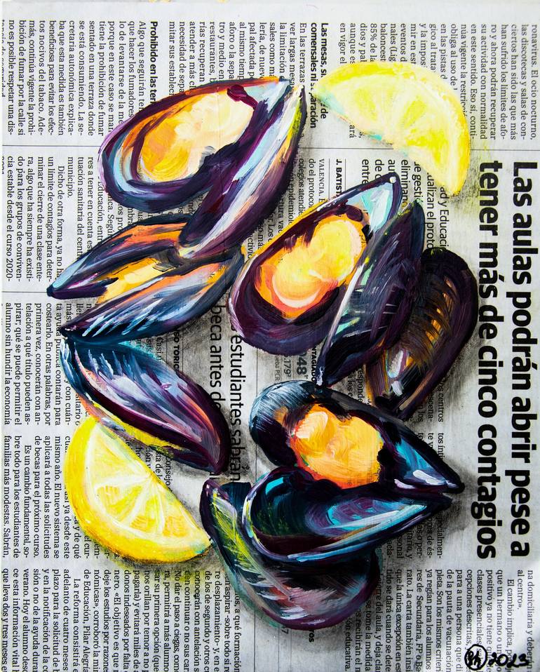 - Size: 10x8 inches - hardboard - Signed on the front and back by the artist (Oksana Shevchenko) Plunge into the depths of culinary and artistic pleasure with my new oil painting. This original painting features mussels, delicate shells and lemons, skillfully crafted to bring the charm of the unde...