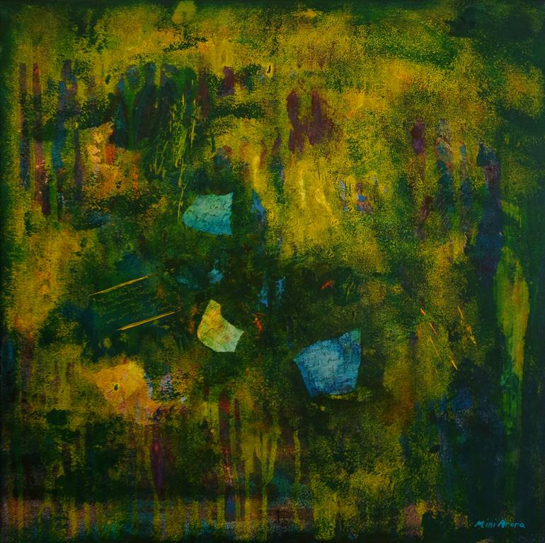 "I primarily paint abstracts whether it be in acrylic, oil, mixed media or collage... Colours and textures are always my main focus. I love to work in layers, often scraping back to see existing colours. I find that through the years of painting my influences have remained the same...Joan Snyder, Richard Diebenkorn, and Gerhard Richter to name the prominent ones. Even though languages and writing were my first passions, I graduated (as a mature student) from the University for the Creative Arts in London with a degree in creative arts. I have exhibited in India and in England. In the US I have had my works in exhibitions at Rutgers State University, The Works in San Jose and the San Jose Museum of Quilts and Textiles. In 2006 my work was chosen for the prestigious Lalit Kala Academy show in Karnataka, India. In May 2015 a painting was selected for a National Level juried exhibition where it won an award by Bodhi College of Art. I was born in Delhi, India, I then spent my childhood in England, and the beginning of my married life in California. I now live and work in Bangalore, India, and travel extensively to the UK and the US." Mini Arora's work is appreciated by collectors in the US, India, England, France, Scotland, Australia, Singapore, Austria and The Netherlands.