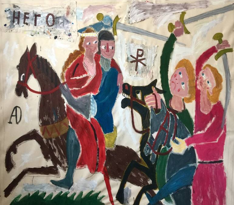 My Hero is part of an ongoing series of paintings Inspired by the famous illuminated manuscript known as the Codex Manesse. I hope viewers will be uplifted and entertained by the heroic content.