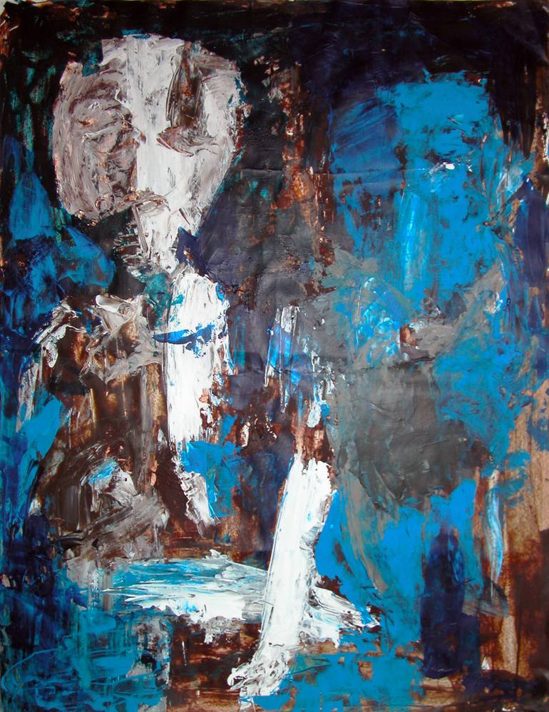 There was this period that I tried to make portraits in blue, white, black and brown and I wanted them to be painted on paper. My idea was that people can crumble when they get older - as my portraits. This is a self portrait symbolizing the idea that I always have a companion: my better or sometime...