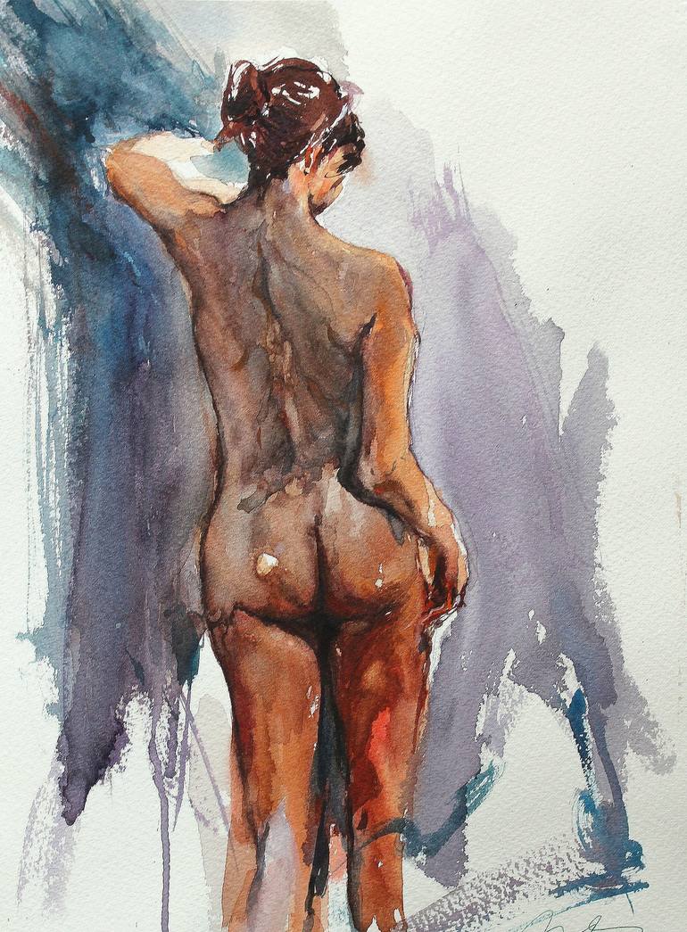 Personal study in Watercolor of a body made with live model in studio: 11 W x 15 H inch. (29x38 cm) "My Love is dressed in light" particularly oriented to study the way to how skin and tones reflects the pure highlights and how they connect with the cinereous blue of the bed sheet on foreground; on ...