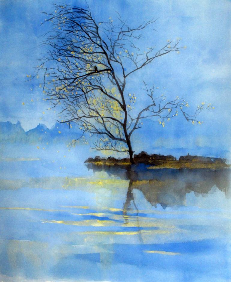 "My Secret Diary_Early Morning" is a captivating original ink drawing on silk canvas, enhanced with delicate gold powder. This contemporary painting captures a late autumn morning riverscape, reminiscent of a crisp October dawn. The artist was inspired by the quiet solitude of the scene. A brillian...