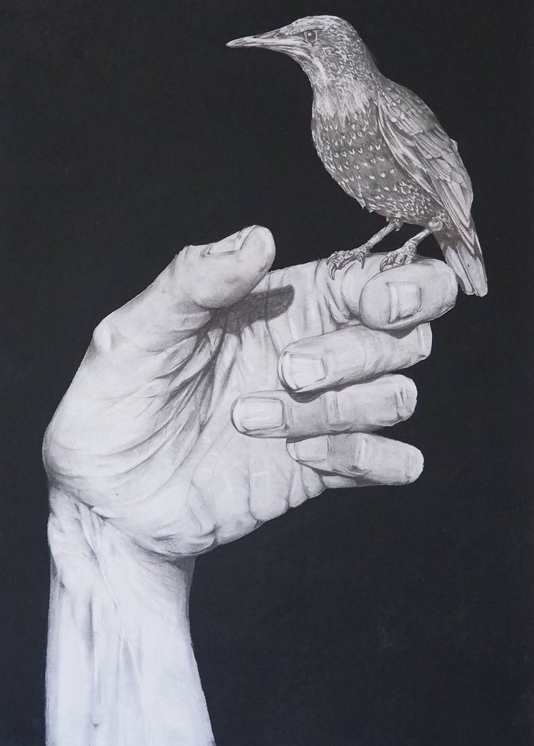 A photorealism illustration of a starling perched on a hand bridging nature with humanity in a harmonious symbiosis. Inspired by the alarming decline of the bird population in the United Kingdom. It is our time to help in the conservation efforts.