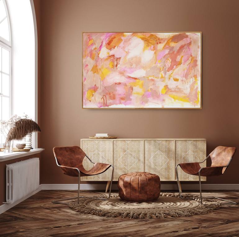 This extra large abstract painting is inspired by colors of sunset, warm hues of orange, pink, yellow, terracotta and cream create a mellow atmosphere. Acrylic paint and oil pastels on unstretched canvas. The painting is painted all over, the size is referred to canvas, please keep in mind dimensi...