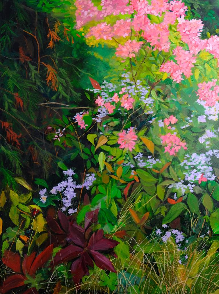 Wild Garden is a series of paintings inspired by the garden I planted in concert with nature. In fact I have let the garden run wild. The weeds are as welcome as the flowers, shrubs and trees that I planted. I am a city girl transplanted to the country with no experience of how things grow. It did...
