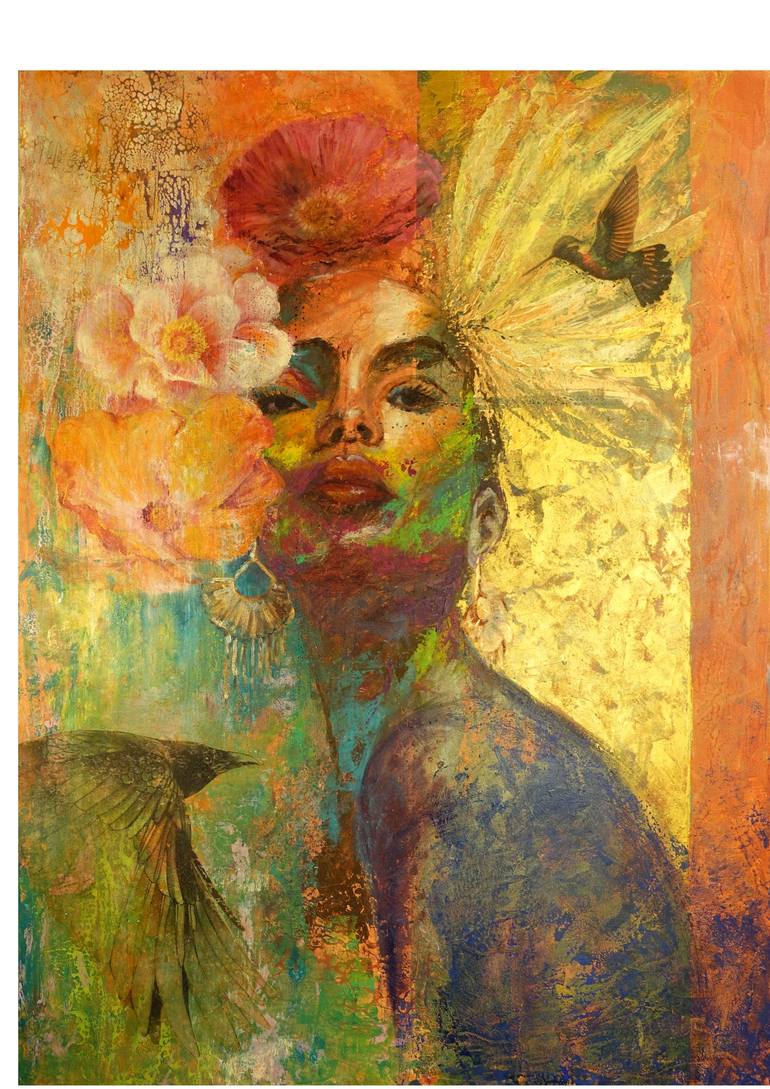 She reminds us with very much of charming lady. She express herself with confident, just like happy with birds. The painting with oil, acrylic and collage (birds) technique to create the art work.