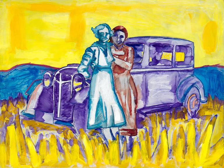 "Myra and Frieda Pose for Joe" by Taos Painter Allegra Sleep, measures 30"x40". Painted in mixed watermedia (acrylic and watercolor), on Hardboard, and framed in a simple black wood frame. The painting was created in 2019 and was a part of the solo show "Time, Travel: New Work By Allegra Sleep" wh...