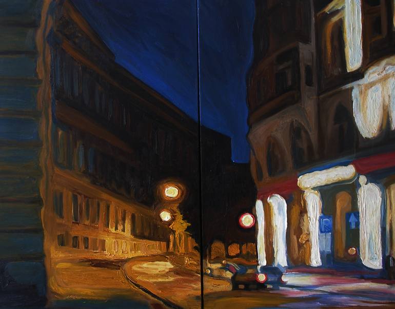 It is the work of a series of "Colored night." Night, evening, twilight landscapes of the city and its outskirts, as well as airports, railway stations. Evening city changes its appearance, the houses, the streets become mysterious, enigmatic, dreamlike. This is a diptych, each of parts depicts the ...