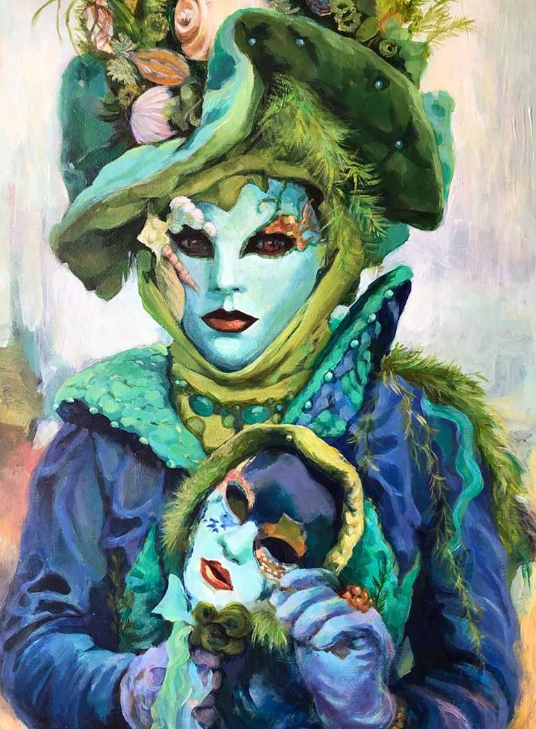 This painting was impressed after attending the Venice Annual Carnival. This is the Queen of the Sea, a beautiful stranger in a costume of the colors of the sea ... Masks ... what is hidden under them? We can see only the eyes ... we do not know anything about this person ... this is a mystery .. sh...