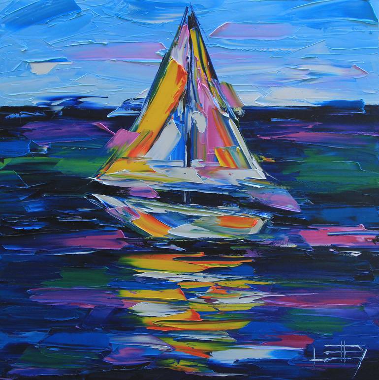 A beautiful painting inspired by the amazing sailboats in the Monterey Bay, in Northern California. As we sat on the beach on a beautiful day in March, I painted a plein air (outside) using a gorgeous coastal palette of blues and purple. I then came home and scaled it up to 36". READY TO SHIP! *Ti...