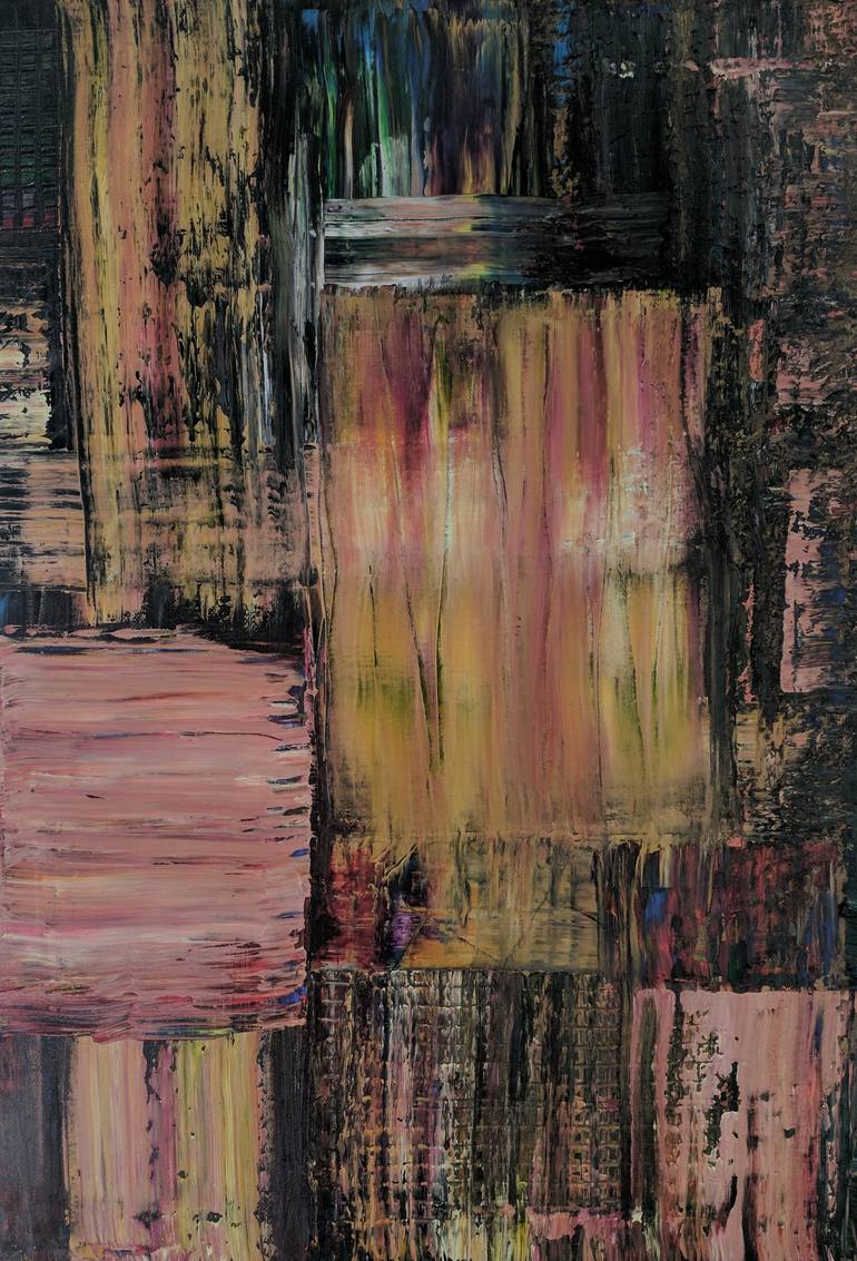 Painting: Oil and acrylic paint built up over days of layering on canvas. The result is a beautiful eye catching texture to the painting. The various areas of the painting seem to have their own painting within a painting.
