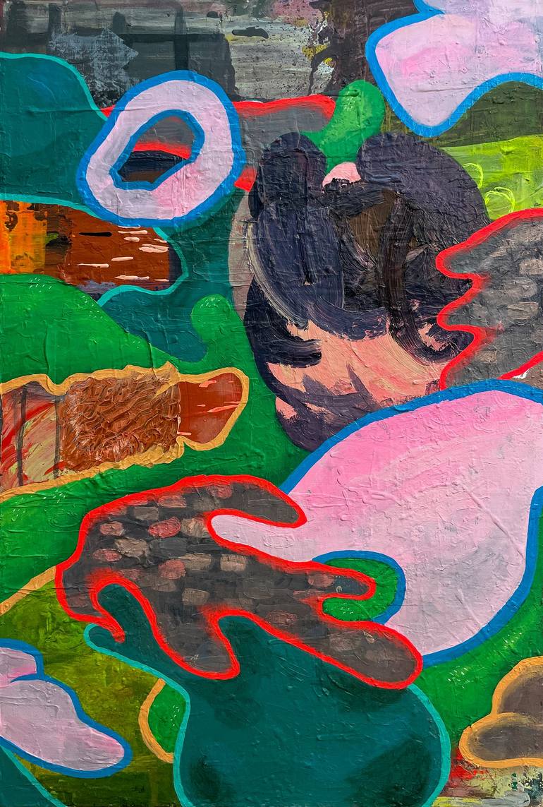 "NO PSL THNX" 2021 Acrylic, gouache, and ink on stretched canvas 20 X 30 X .6 inches (50.8 x 76.2 x 1.5 cm) From a series of paintings that form a narrative based on subverting messages, changing appearances, and keeping certain truths obscure. “Everyone paints their own image, either via social me...