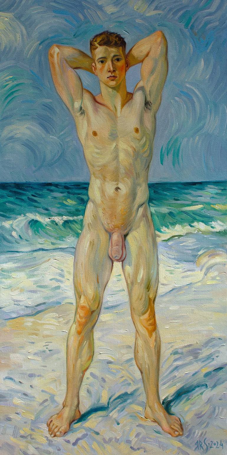In this captivating oil painting, a young man stands on a sun-kissed beach. His naked body is sculpted and firm, each contour defined by a masterful brushstroke. His unabashed nudity symbolizes a return to nature, celebrating the beauty of the human form in its most authentic state. The way the ligh...