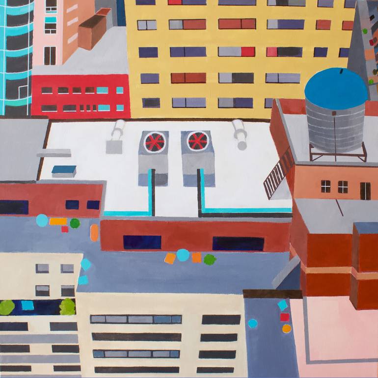 My aerial-view paintings represent diverse places and spaces of the contemporary landscape seen from an above ground perspective. The flattened surface planes convey the textures of abstract space enhanced by compositional aesthetics. From the elevated position of high-rise buildings and helicopters, my images of cities and towns, factories and farmlands, power plants, suburban communities and highways are delivered with a distinctive angle on structures frequently taken for granted. My silk-screens are my paintings close cousins, only in a smaller format and using a different medium. Projecting my interpretation of the same concept and approach, they are executed in a variety of serigraphy methods from digital design to hand drawing that produce multicolored images. My figurative paintings--some are individuals, some different pairings of couples, two friends or a pair of lovers, and some are family groupings--evoke a stylized impression of the culture or the persons. Juxtapositions of strong colors combine with a graphic viewpoint and shapes to convey a feeling of time and place and individuality. My appreciation of unconventional views come together in my up-close, paintings of food. While the colors and shapes are traditional, the oversized proportions painted from above display the subject in a way that is both original and recognizable. Overall, I strive to blend a fresh perspective with a savvy demonstration of the power of color and composition.