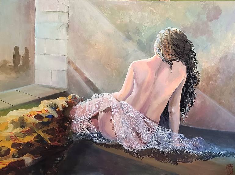 Subtly erotic nude painted on canvas This is a large acrylic painting, done on one of the highest quality canvas. Transparent sunny morning rays pierce the delicate and beautiful body of this model.