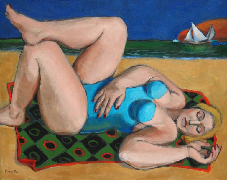 I love painting strong unselfconscious women in the course of their everyday lives. Here a voluptuous woman naps on the beach as sailboats race about near an island in the distance.