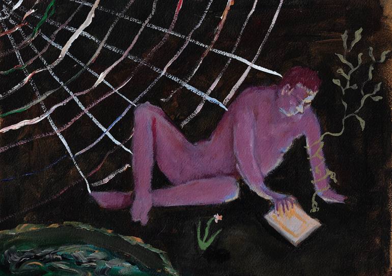 A modern interpretation of the classic myth. Yes, the pool is there, but the reflection that Narcissus is interested in is the feedback from social media on his tablet. He's been scrolling so long that a vine has twisted up his arm and a spider used him as an anchor to spin her web.