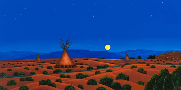 This is an imaginary scene where two western cultures of Native America meet. Pueblo Indians would go out onto the Great Plains to hunt buffalo and Plains Indians would visit the trade fairs in northern New Mexico. A rising full moon lends an air of mystery and majesty to a beautiful Southwest lands...