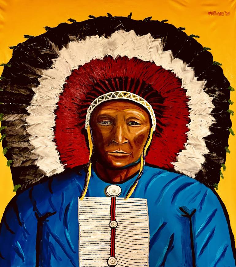 This is a BIG PAINTING!!!!! I bought a large piece of canvas and had to nail it to a wall in my studio. The upper portions of this piece were done on a ladder. I have painted several famous Native Americans in the past, but I wanted this painting to be a "Jaw-Dropper". The yellow used for the ba...