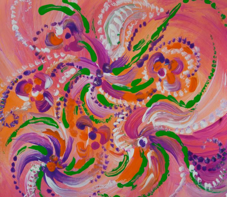 Abstract flowers like image in bright colors with natural swirls on pink background, with round shapes, bended lines and abstract shapes in orange, fuchsia, purple, violet, green, light green and white colors. Miniature painting realized with tempera colors on a small size orange colored cardboar...